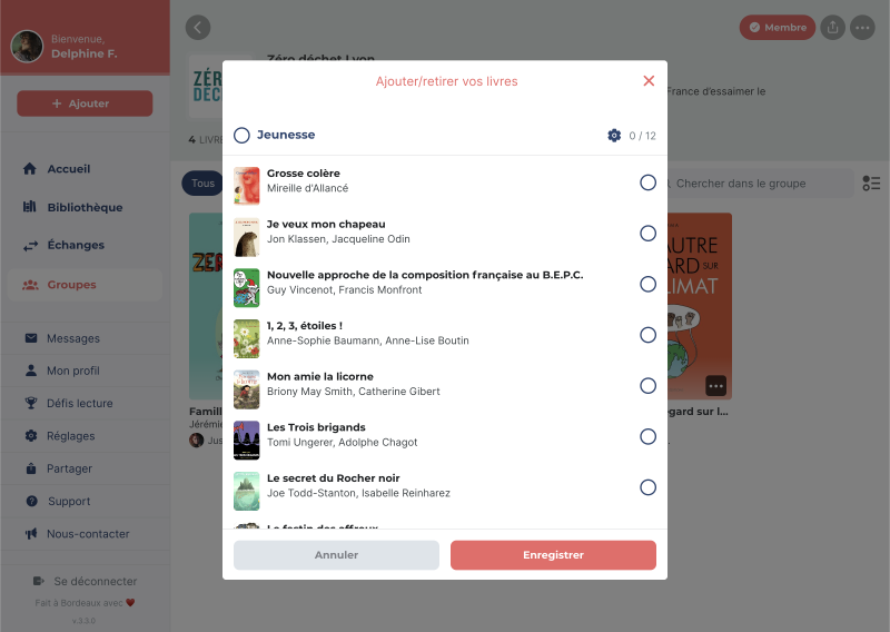 Pour ajouter ou retirer des livres dans un groupe dont vous êtes membre, allez sur l'onglet Groupes puis l'onglet Les miens et retrouvez le groupe dans lequel vous souhaitez agir. Appuyez sur le menu … et choisissez Ajouter / retirer vos livres. Une fenêtre s'ouvre dans laquelle vous pouvez ensuite sélectionner les livres à ajouter ou les livres à retirer.
