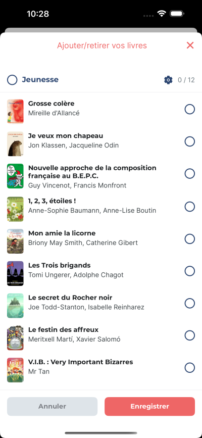 Vos livres sont présentés par étagères. Cochez l'étagère pour sélectionner tous ses livres ou cochez les livres individuellement. N'oubliez pas d'appuyer sur Enregistrer en bas à droite pour confirmer vos modifications.