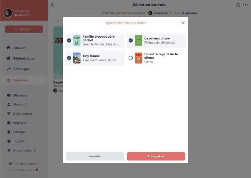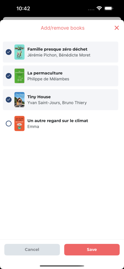 Faite la même procédure que pour l'ajout, mais au lieu d'ajouter des livres, désélectionnez ceux que vous souhaitez retirer. Appuyez sur Enregistrer pour valider vos changements.