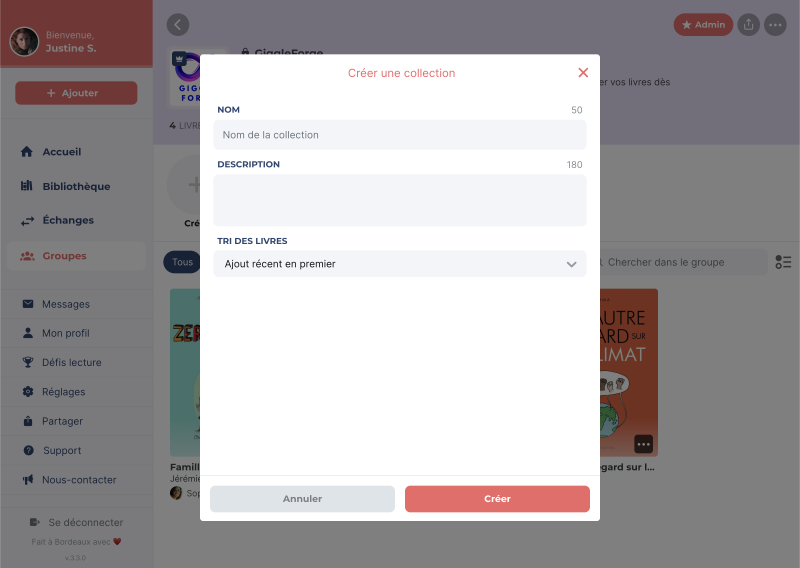 Depuis la collection, allez sur le menu puis choisir Modifier. Une fenêtre s'ouvre où vous pouvez remplir les informations de la collection : Nom, Description ainsi que choisir le Tri des livres (par ordre alphabétique, chronologique etc.). Puis appuyez sur le bouton Enregistrer.