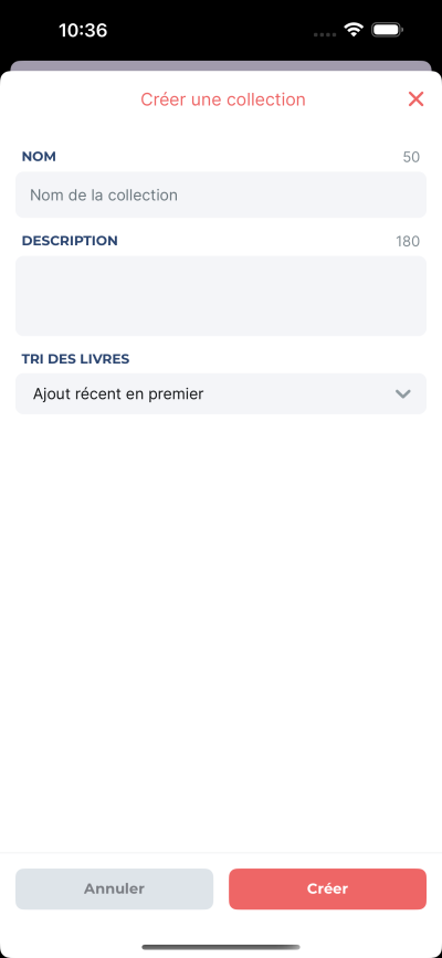 Pour créer une collection, appuyez sur le cercle + en haut. Une fenêtre s'ouvre où vous pouvez remplir les informations de la collection : Nom, Description ainsi que choisir le Tri des livres (par ordre alphabétique, chronologique etc.). Puis appuyez sur le bouton Créer.